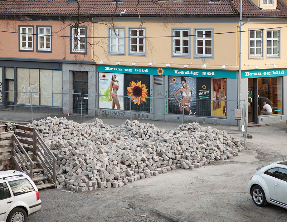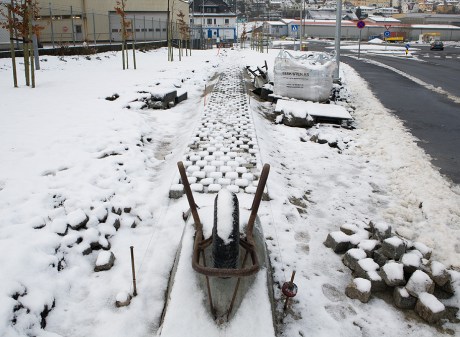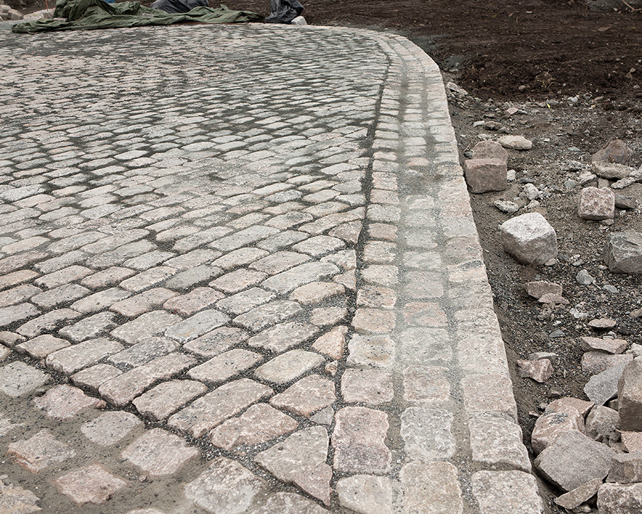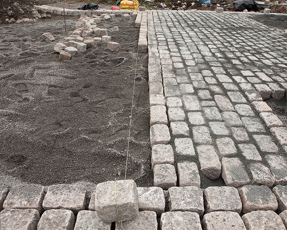 I gamle dager ble det lagt brostein i gatene. Nå legges denne for det meste der det ikke skal kjøres. Her fra arbeidet med rundkjøringen i Minde Allé: