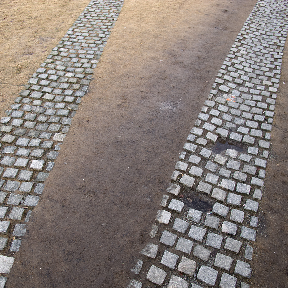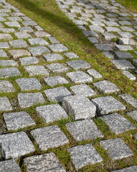 Mellom trærne er det laget to stier av brostein. Disse blir nok mer dekorative enn gode å gå på.