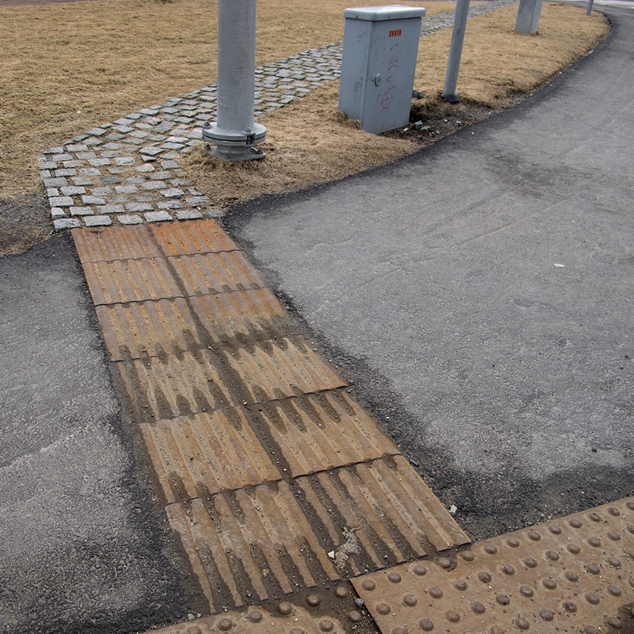 Disse gangstiene av brostein var muligens en god idé. Men de er utført på en måte som gjør dem vanskelige å bruke. Kanskje rett og slett snublefeller, dette.
