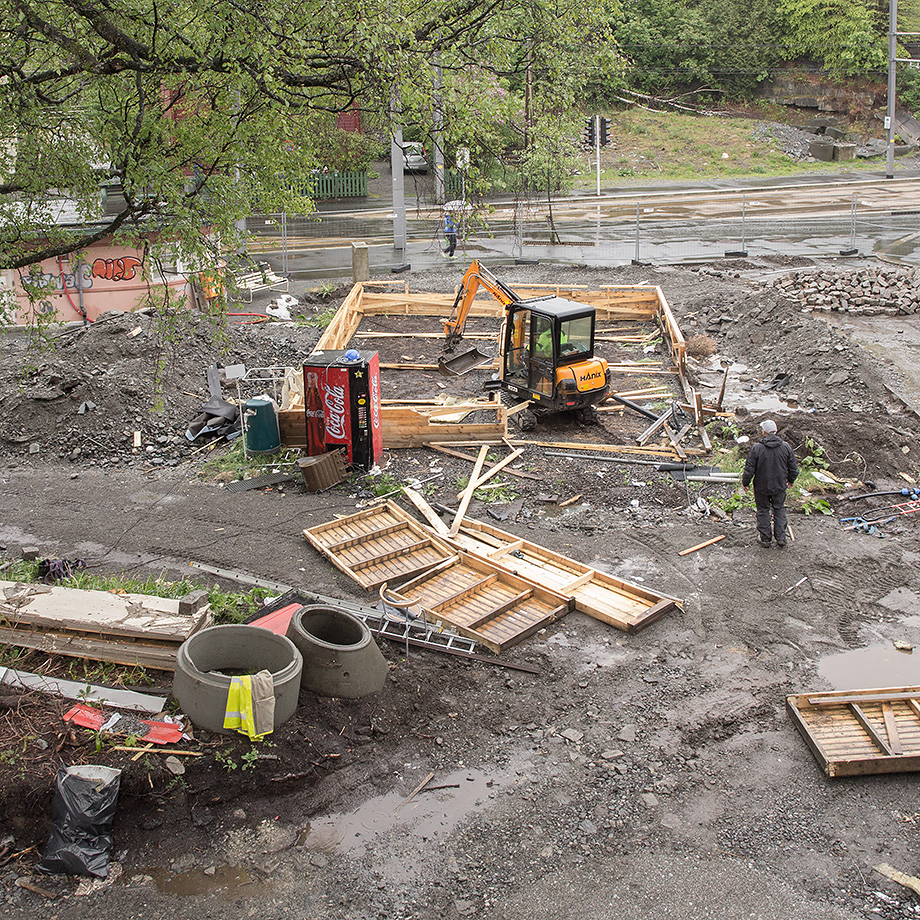 I går startet fjerningen av brakkene som ble satt på Ambrosia Tønnesens plass i mars 2012.