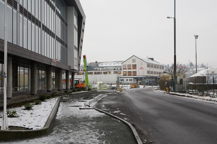 Før bussruten (midlertidig?) ble lagt om i forbindelse med bygging av bybanen, ble bygget til Minde trelast/Gulvspesialisten i Minde Allé revet.