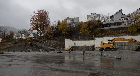 Utgraving av tomten begynte i fjor vinter. i går kom byggekranen på plass.