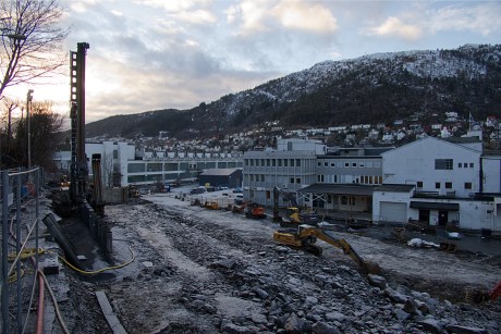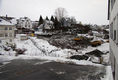 På tomten bak meieriområdet er grunnarbeidene i gang. Husene som sto her ble revet for et års tid siden. Nå skal det bli 8 etasjer leiligheter her. Det første bildet er tatt 17. januar: