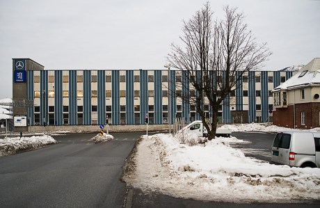 Kanalveien slutter i fasaden til dette verksted-/kontorbygget som tilhører et bilfirma.