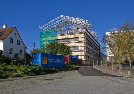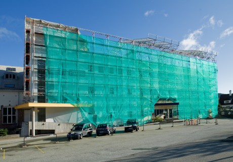 Fabrikkgaten 3 har fått et stort stillas bygd opp omkring seg, så her skal det nok foregå noe.