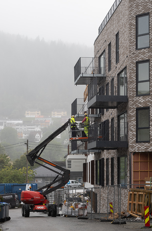 Det monteres balkonger på nybygget i Fabrikkgaten 7A. «Kronstad stasjon».