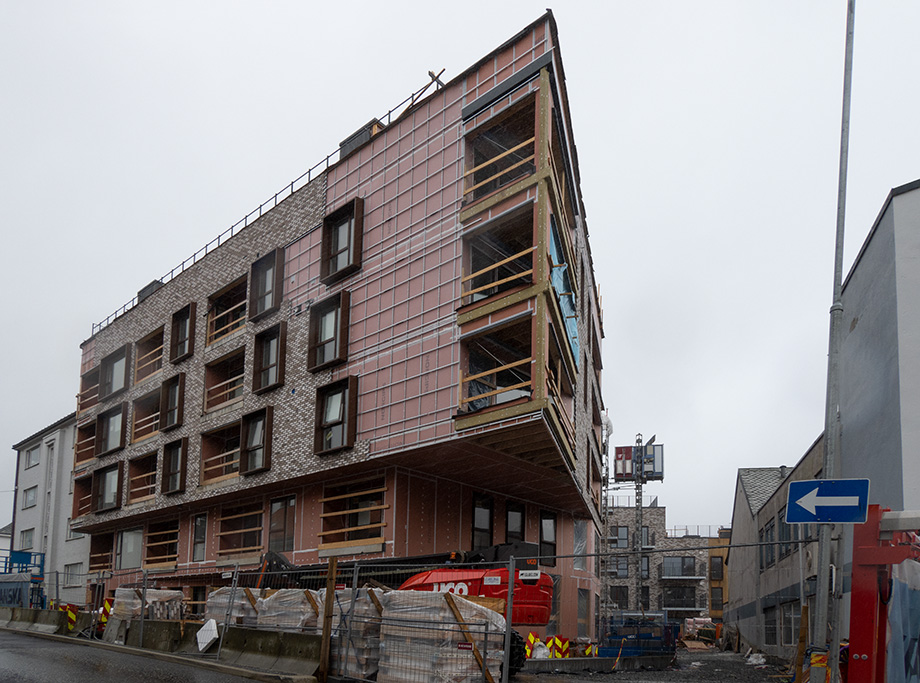 Hus A i Kronstadparken, trinn 3, har stått delvis tildekket av presenninger noen uker. Bygging av hus B og C er godt i gang.