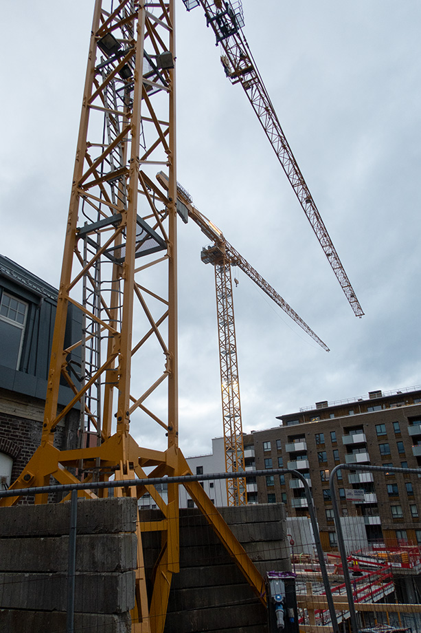 Kraner viser bygging av leiligheter på begge sider av Fabrikkgaten.