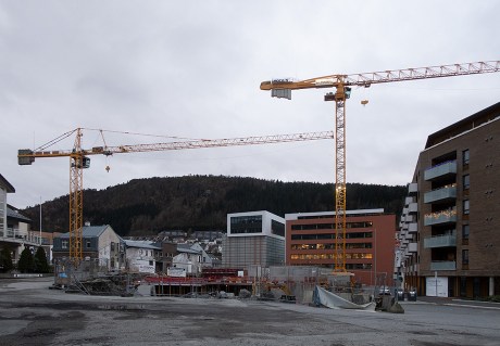 I bakgrunnen ser vi byggekranene på begge sider av Fabrikkgaten.