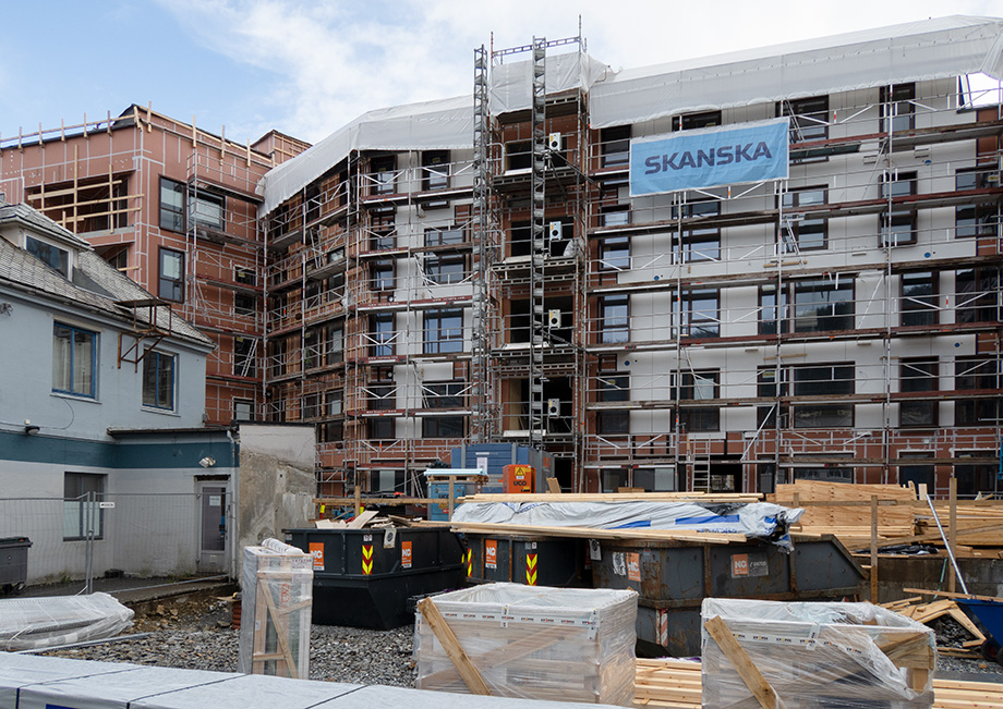I bakgrunnen skimtes kranen på andre siden av Fabrikkgaten der det også bygges nye leiligheter.