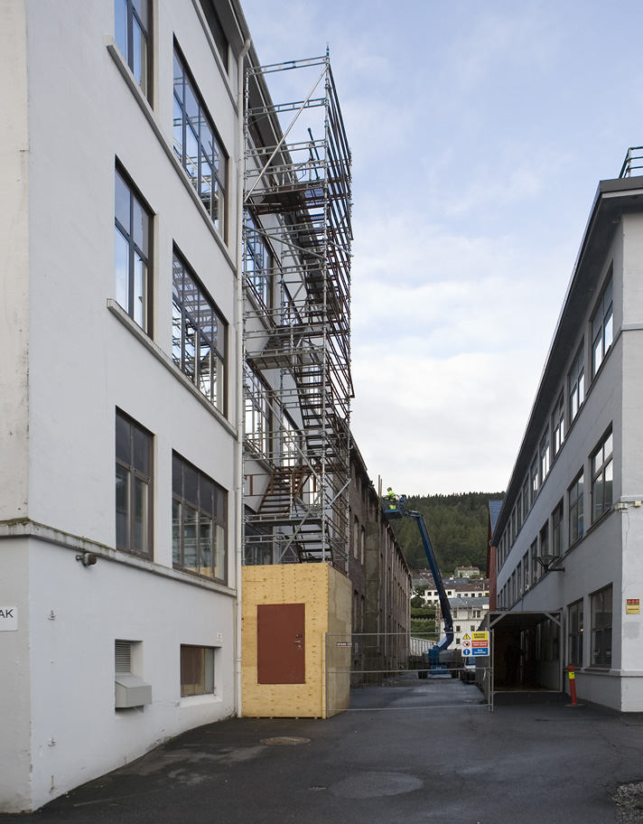 Siden juni er det reist to nye heis-/trappetårn i bygget.