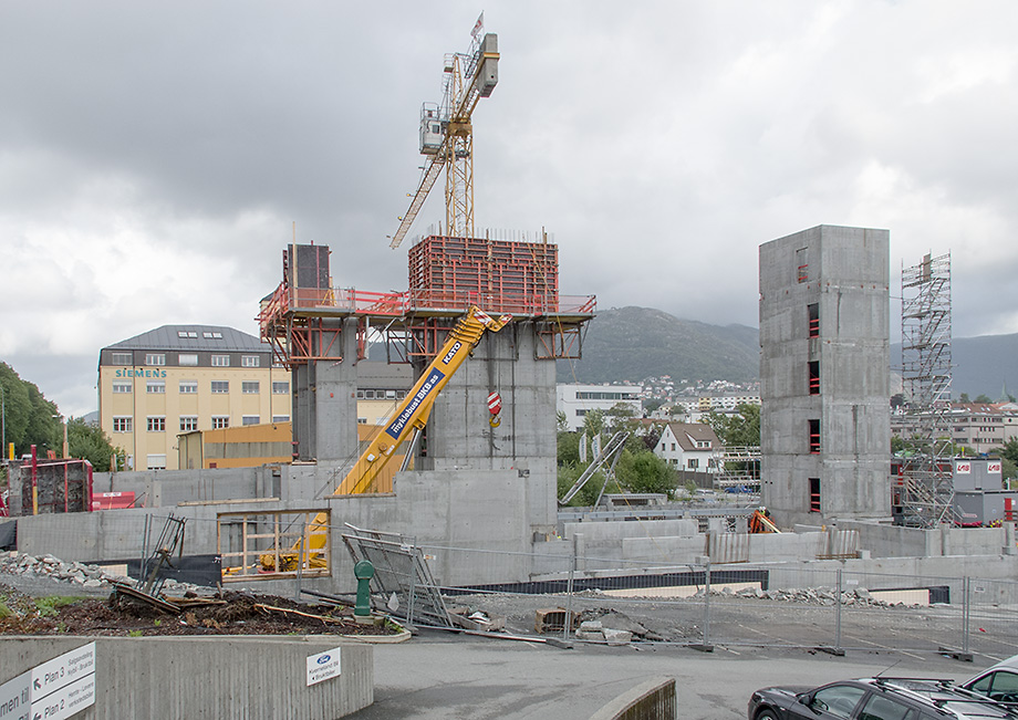 Det er nå et år siden bebyggelsen mot Bjørnsonsgate ble revet, og det går an å få et bilde av nybyggenes utstrekning. Dette er OBOS´ første prosjekt i Bergen. Her skal det bygges over 300 leiligheter i flere byggetrinn i årene fremover.