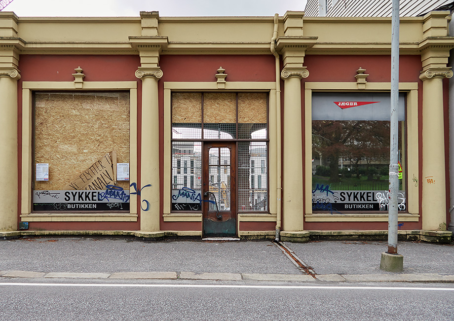 Restene av fasaden mot Kong Oscars gate. Innmaten rives, men fasaden blir stående.