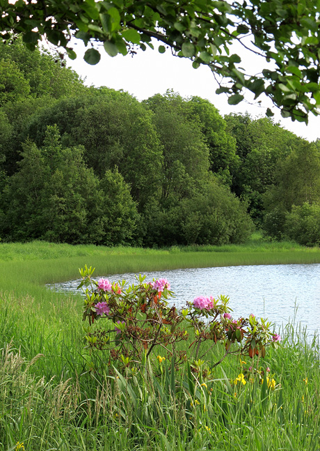 Ved Kristianborgvannet står en rhododendron ute i vannkanten mellom iris og takrør. Den ser ikke til å trives noe særlig, men blomstrer litt. Liknende planter befinner seg i et bed på andre siden av stien, noen titalls meter unna.