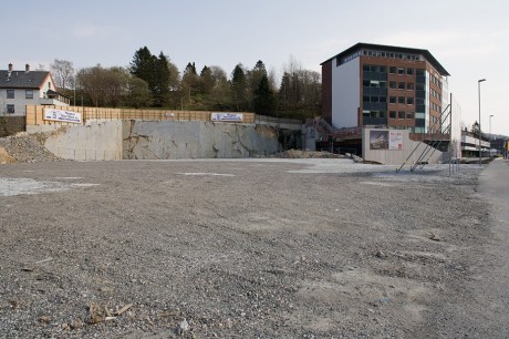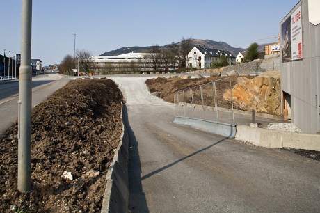 Langs nedkjørselen til den underjordiske parkeringen er det lagt ut jord, så her blir det kanskje beplantning?