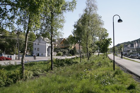 Et lite blikk fra Ambrosia Tønnesens plass, også kalt Trikkesløyfen, opp mot villaen i jugendstil som kan skimtes bak trærne ovenfor bussholdeplassen. De store trærne er en platanlønn og en bøk.