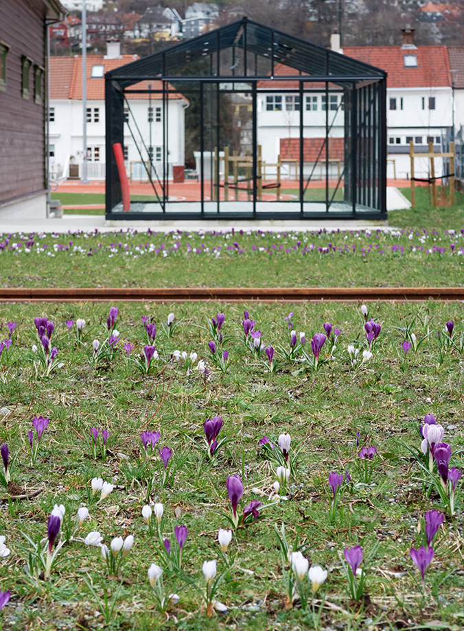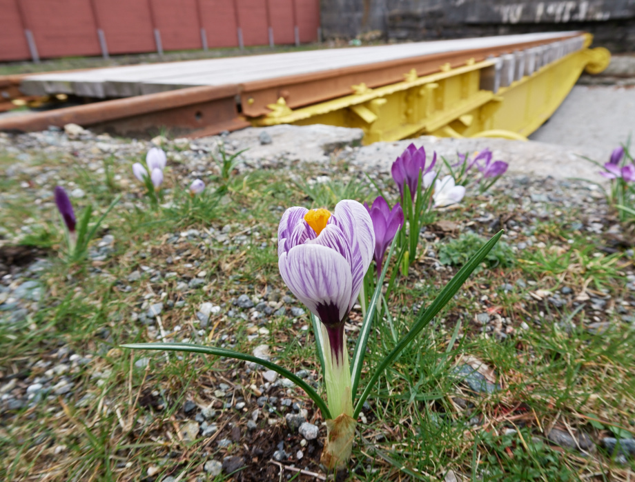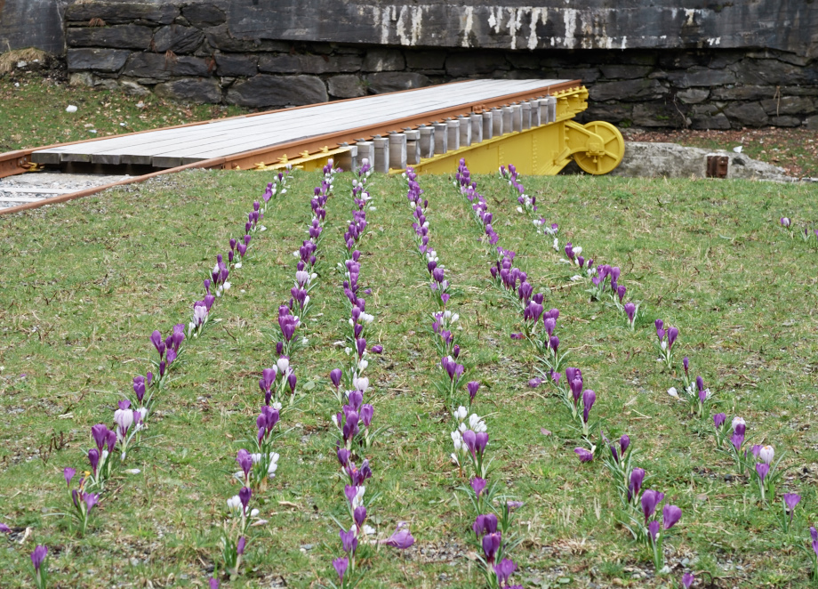 Skiltet er kommet på plass og krokusen blomstrer. Også blant gresstorv og stein der en del av bedet er gravd opp igjen.