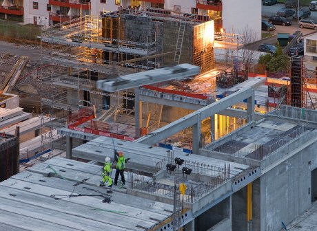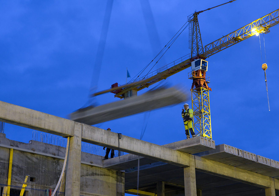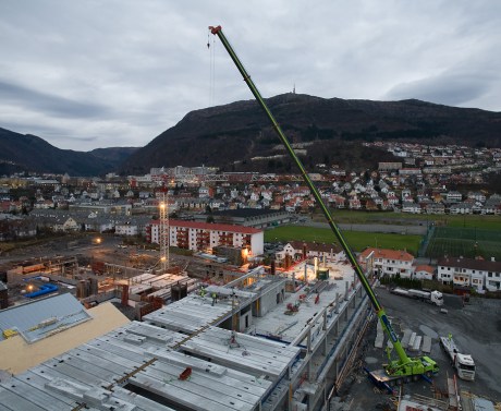 Fortsatt er det mye tak/gulv som skal på plass på høyskolebygget. Elementene heises opp med en stor mobilkran og bukseres på plass ved hjelp av to par hender.