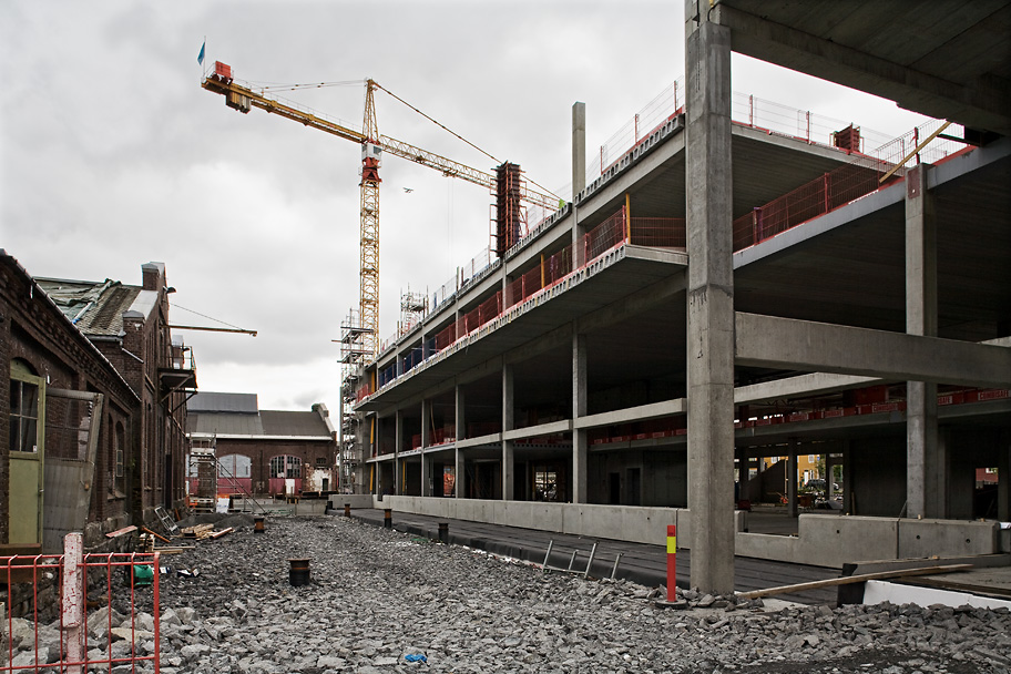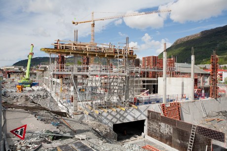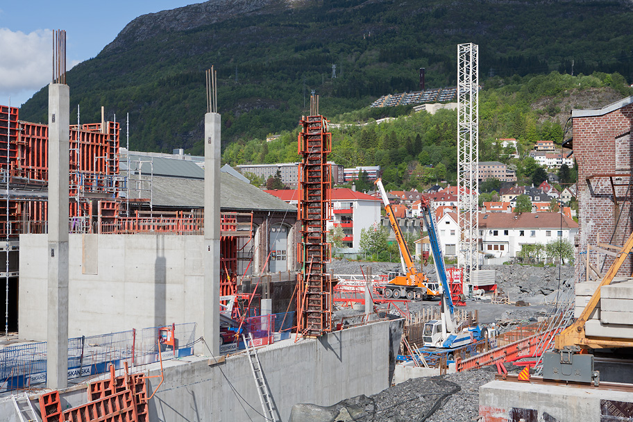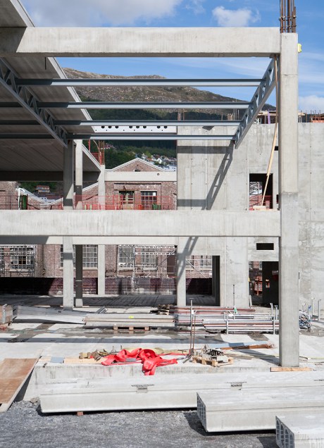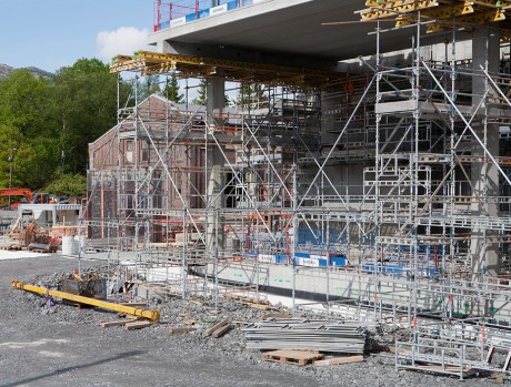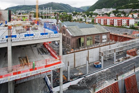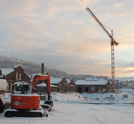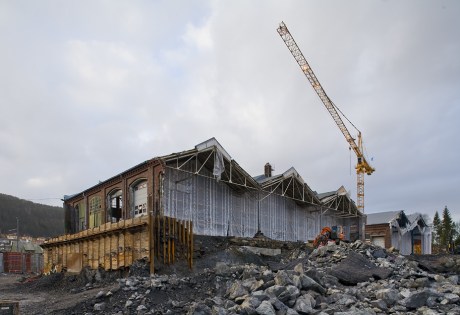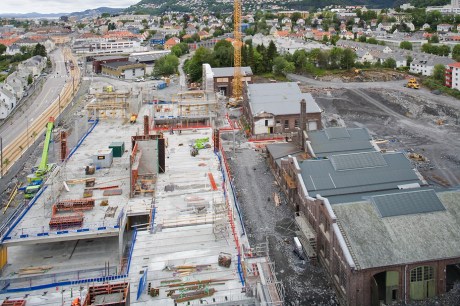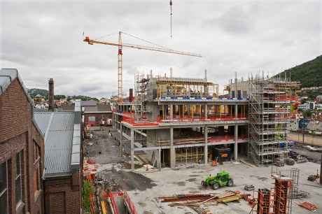 Høyblokken på høyskoletomten har nå nådd 4. etasje og er høyere enn de gamle verkstedhallene.