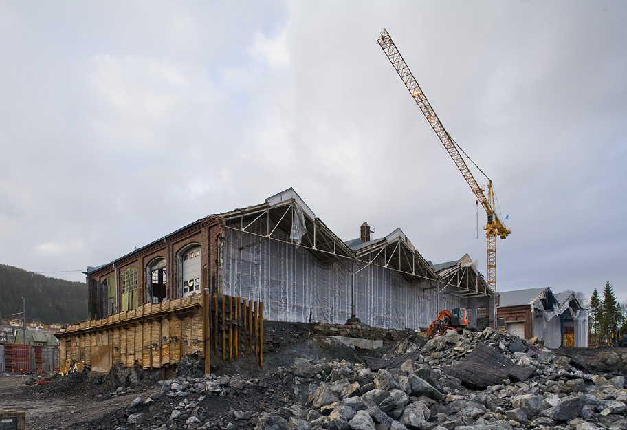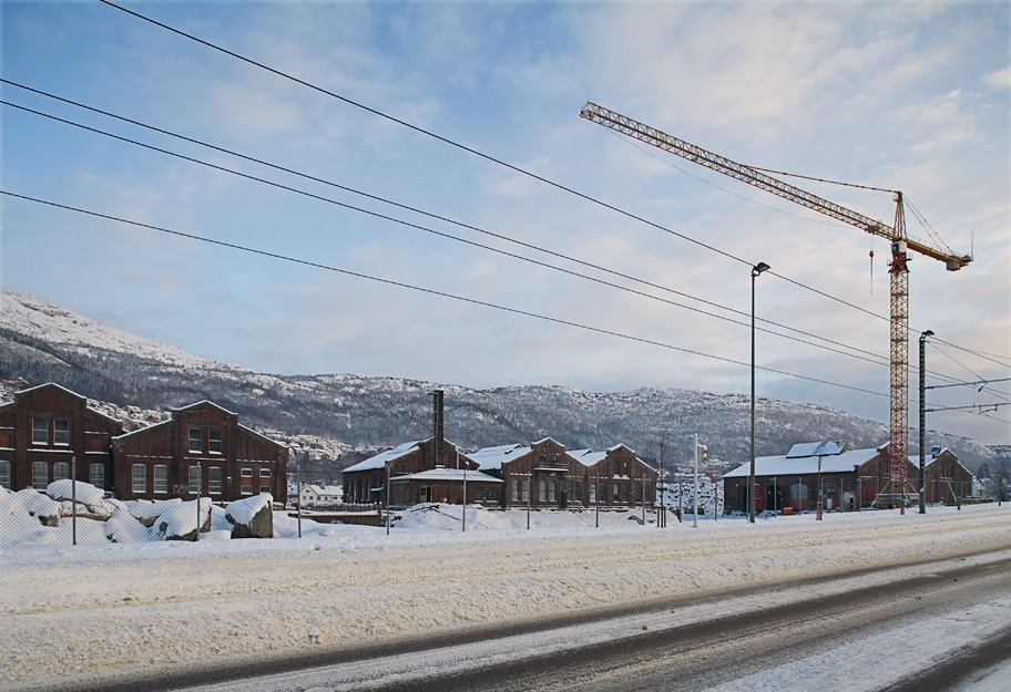 Snart blir de gamle verkstedhallene delvis skjult fra Inndalsveien.