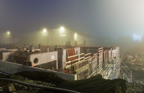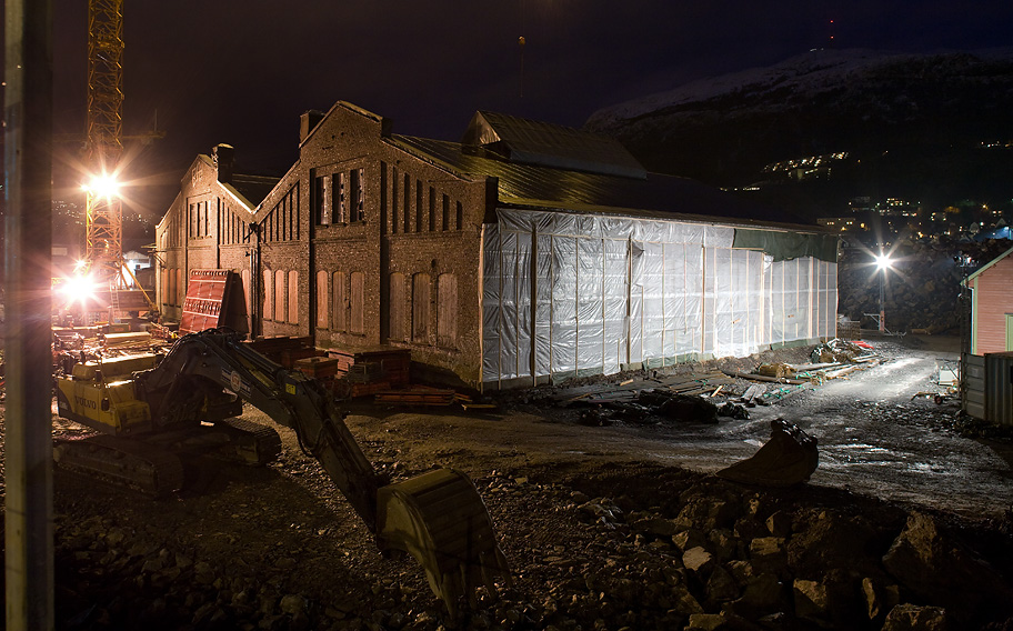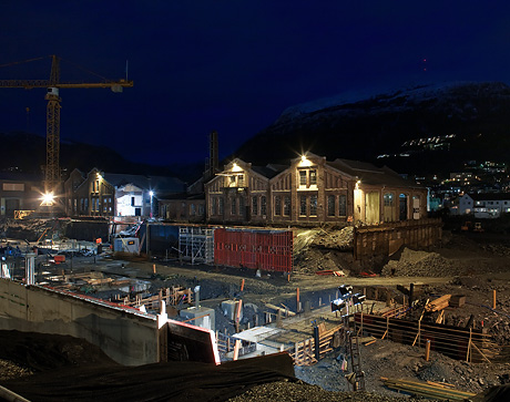 Byggeplassen, hvor forskaling og støping pågår, er flombelyst i januarkvelden.