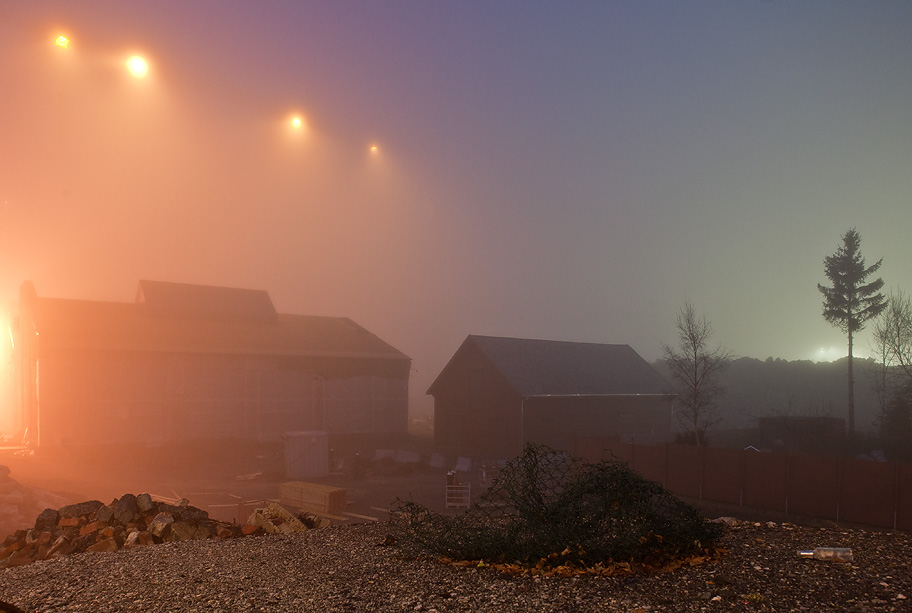 Bergen er innhyllet i tåke. Kranene på byggeplassen på Kronstad er bare synlige som lysende punkt langt der oppe.