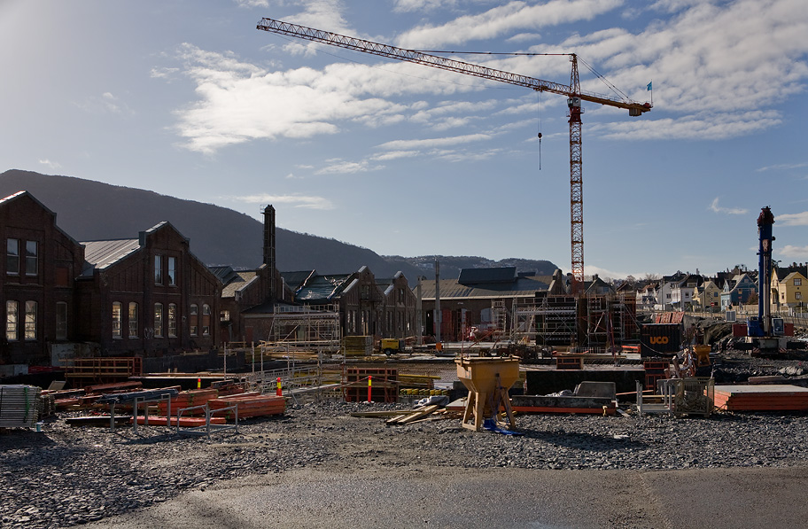 På byggeplassen til høyskolen på Kronstad er det nå kommet en stor kran.