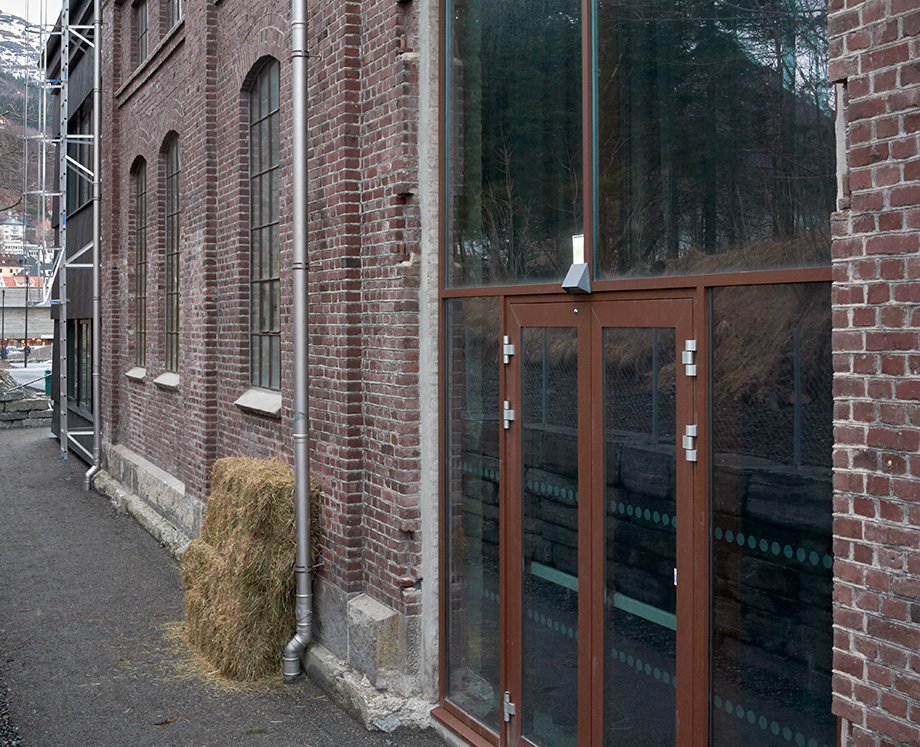 Når lyset er på i trappehuset på HiB blir de perforerte fasadeplatene som et broderi.