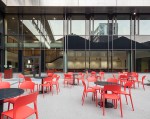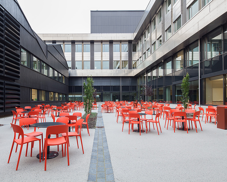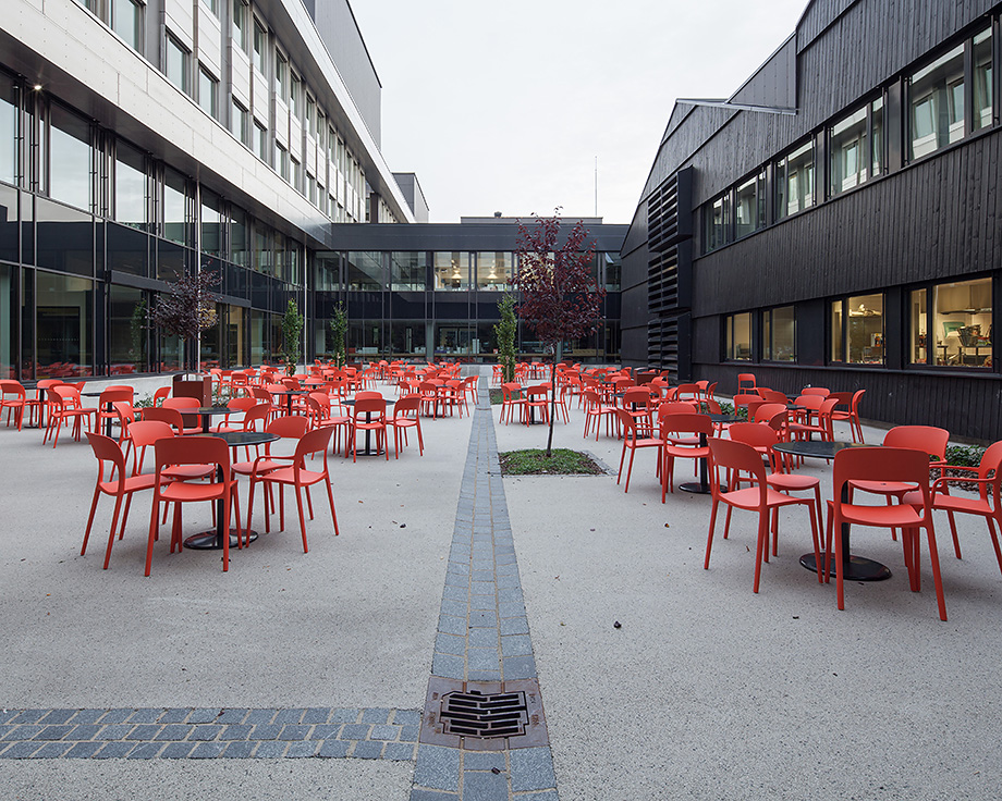 Utenfor kantinen på Høyskolen, Kronstad, er det fastmontert møblement i stål og tre og røde bosskorger.