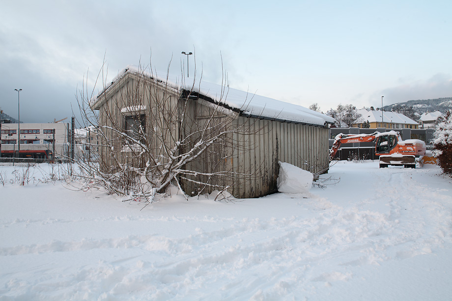Midt imot er teglsteinsveggen som var yttervegg i vognverkstedet fra 1920-årene.