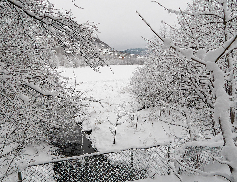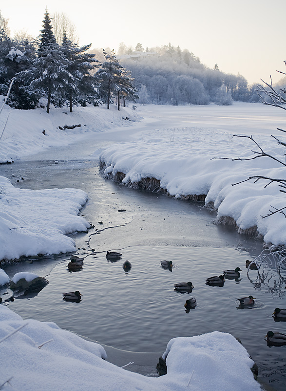Det er minus 12 grader. Kristianborgvannet er tilfrosset, men endene har fortsatt litt åpent vann ved innløpet fra Mindemyren.