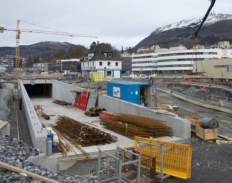Men nå på andre siden av Fjøsangerveien, ved innslaget til bybanetunnelen gjennom Løvstakken.