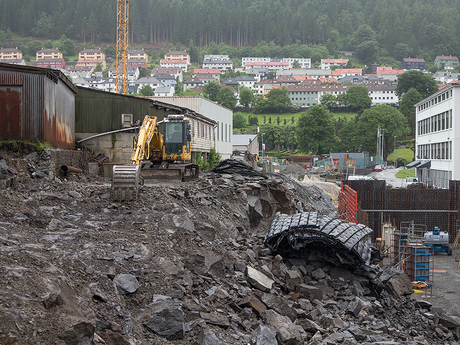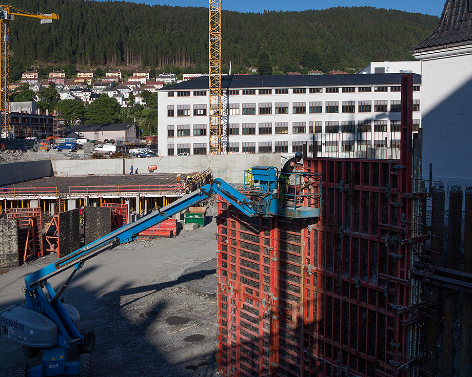 En mobilkran er tatt i bruk for å få betongelementer på plass: