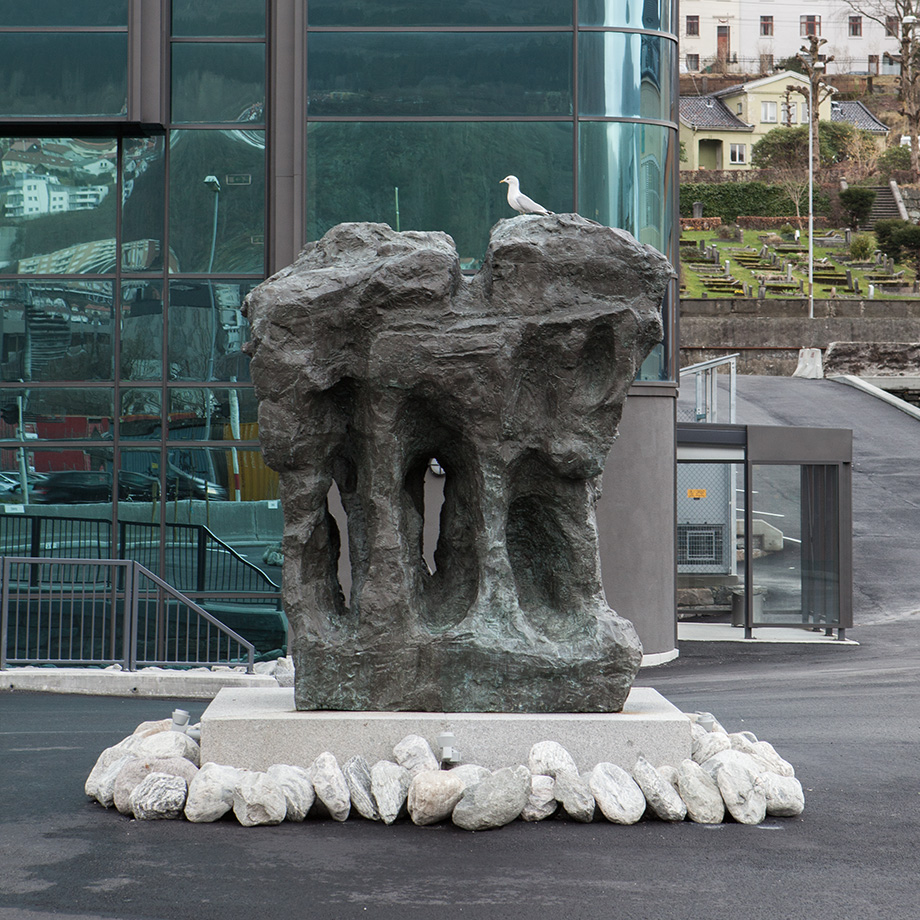Ut mot Fjøsangerveien er det kommet en stor keramikkrukke og en bronseskulptur på en høy steinsøyle.
