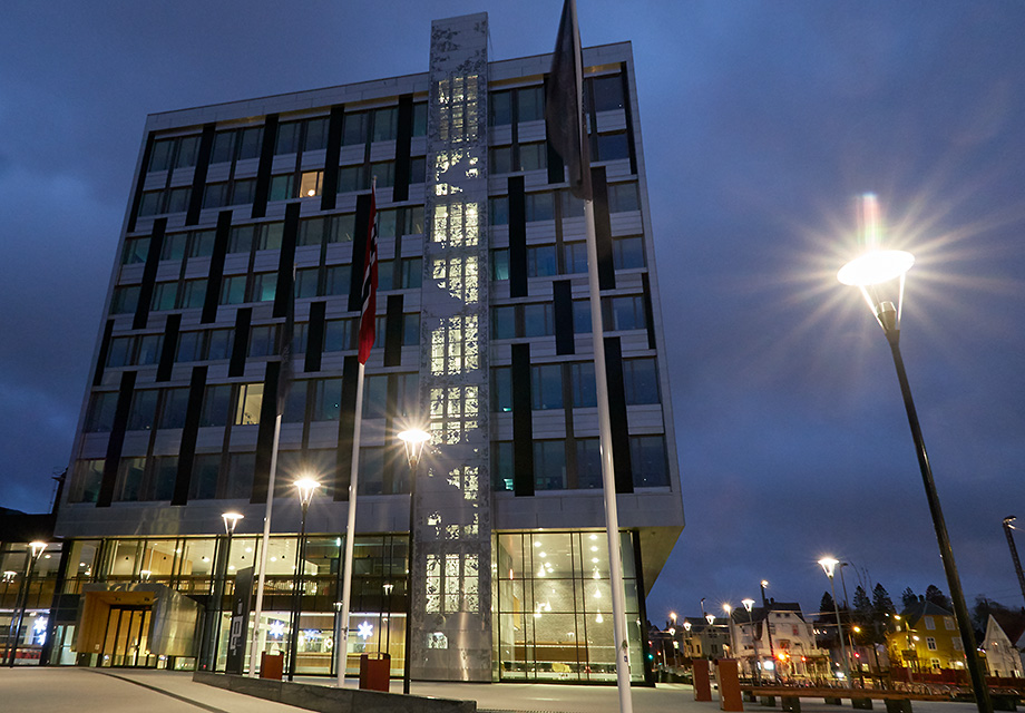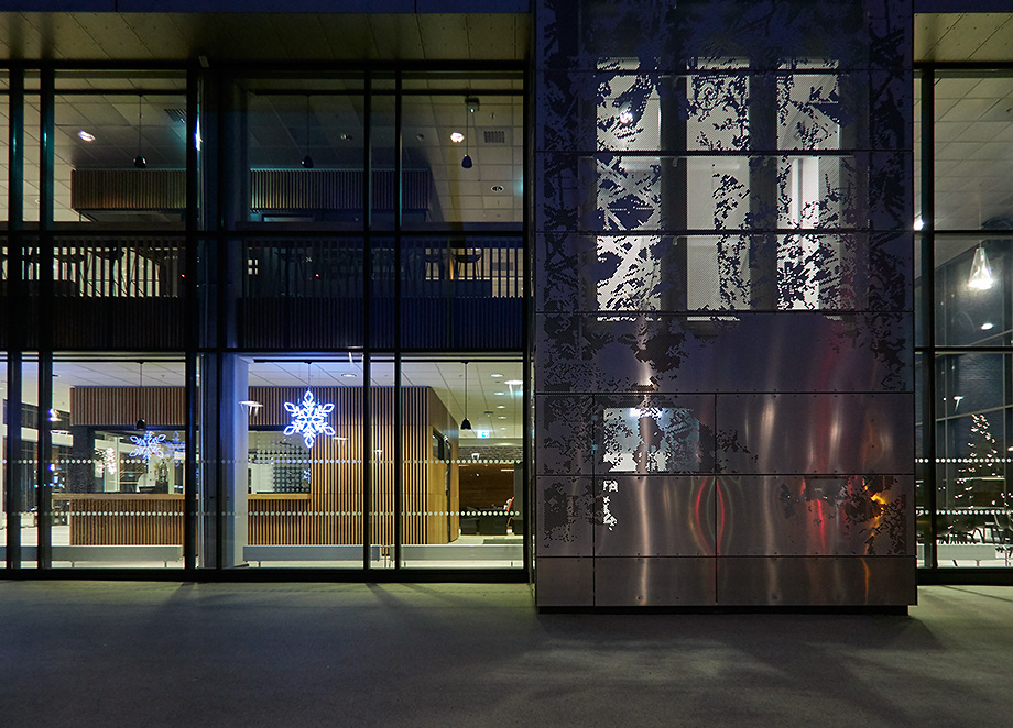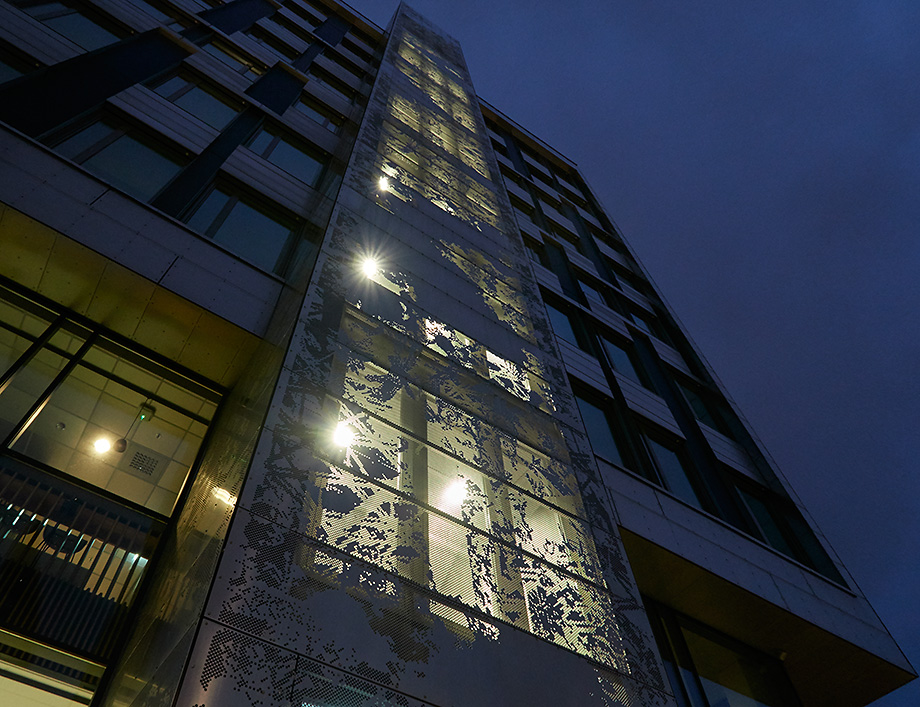 Når lyset er på i trappehuset på HiB blir de perforerte fasadeplatene som et broderi.