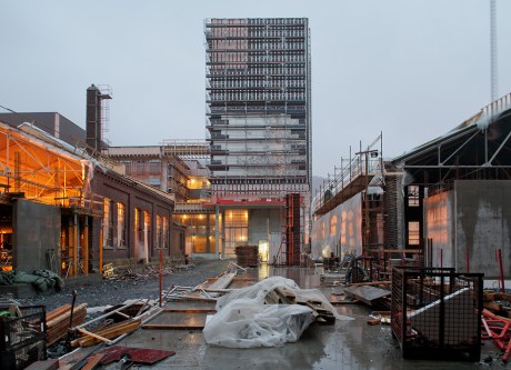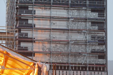 Fasadeplatene begynner å komme på plass på høyblokken til den nye høyskolen.