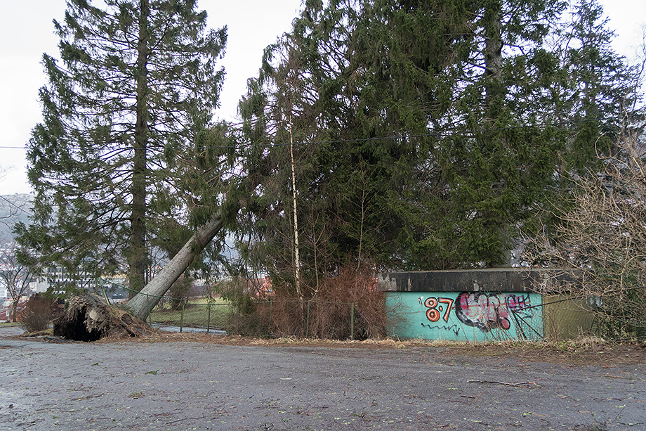 Et tyvetalls trær i Leaparken gikk over ende i stormen Nina i januar 2015. Nå skal 30 trær felles ifølge Bergen kommunes trefellingsplan for parken.