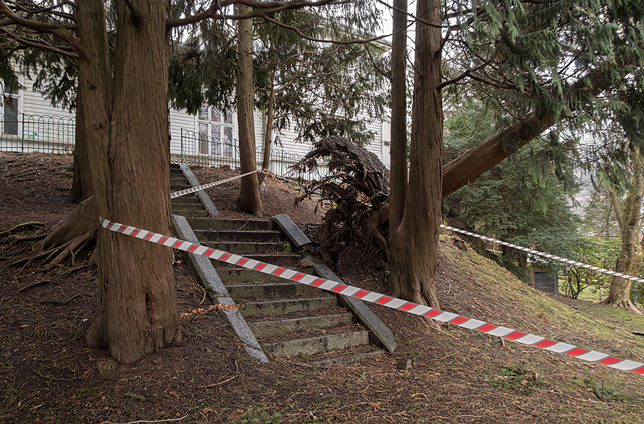 Stormen tok også en av sypressene ved trappen på sørsiden av hovedbygningen. Nå skal de fem resterende fjernes: