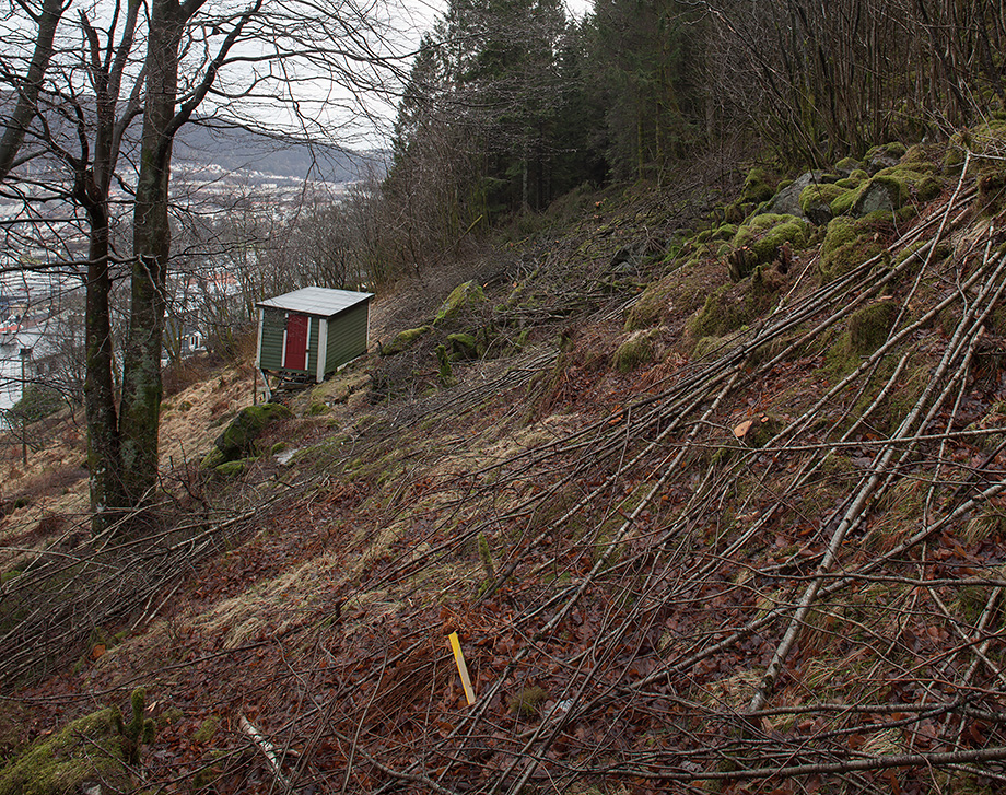 Klatrer du rett opp lia fra endepunktet der Løvstien bygges finner du et område hvor Bergens Skog- og Træplantningsselskap driver flatehogst.