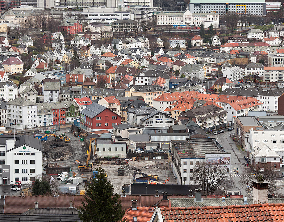 Nå ser det ut som om veien i dette byggetrinnet skal ende ved rasvollen nedenfor stupet i Løvstakken. Herfra er det utsikt mot sentrale deler av Mindemyren, bl.a. Leaparken.