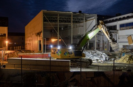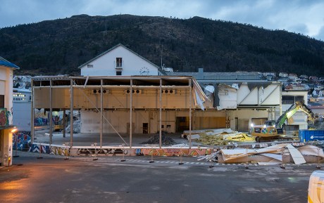 På meieriområdet er tilbyggene til det vernede Tine-bygget revet og mye av den gamle fasaden er synlig.