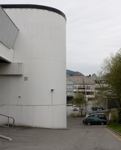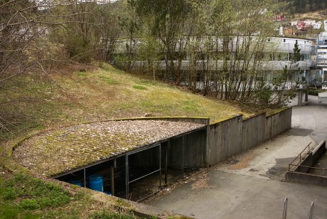 NRK har et sirkelrundt bygg på Mindemyren. Også dette skuret på baksiden har fått halvsirkelform.