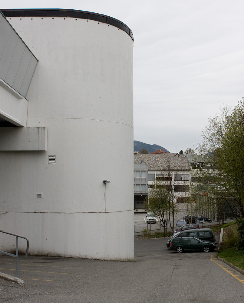 Den store hallen ved siden av er firkantet men har denne runde formen mot øst.