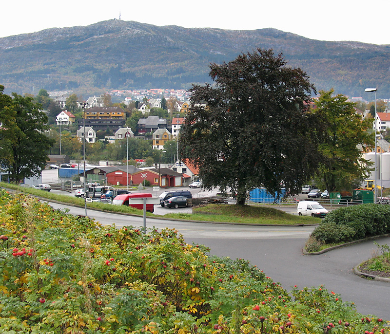 På dette sommerlige bildet, fra juni 2004, ser vi i bakgrunnen to av bøketrærne i Minde Allé. Dette er vel restene av alléen som i sin tid ga denne veien navn? Rosebedet i forgrunnen forsvant i forbindelse med bygging av ny rundkjøring og undergang under Fjøsangerveien. Se post fra 29. mars 2008. På bildet fra dengang ser vi ømfattende graving rundt det øverste treet, noe som kanskje var medvirkende til at treet nå er dødt. Det ble fjernet nå i november.