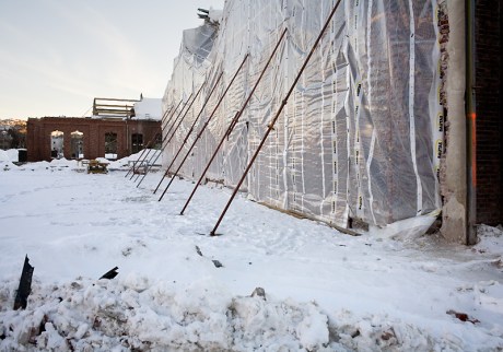 Bygningsmassen på høyskoletomten blir nå redusert ved at verkstedhallene blir «kappet» på tvers. Den østlige delen av hallene fjernes.