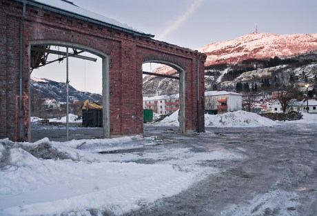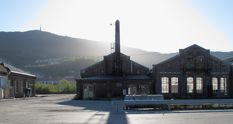 Morgensolen strømmer over Ulriken og gjennom vinduene på de gamle verkstedhallene.