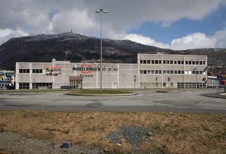 Sør for rundkjøringen ligger dette store bygget som nå får oppussing av fasaden. Bygget rommer blant annet Fagbokforlaget og et stort lager for REMA 1000.