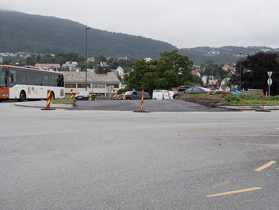 Kjøremønsteret er endret. Kanalveien er stengt mot sør og traséen i Minde Allé flyttet noen meter nordover.