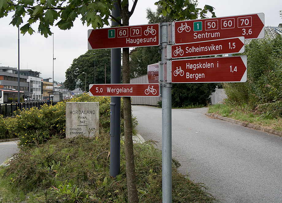 For syklister viser skiltingen at avstanden til Wergeland er 5 km herfra. Det må bety en omveg.