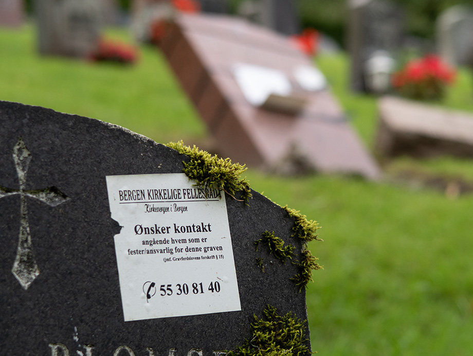 På avsides steder er mange gravsteiner veltet og Kirkevergen ønsker kontakt. Eller ønsket. Lappene har stått lenge.